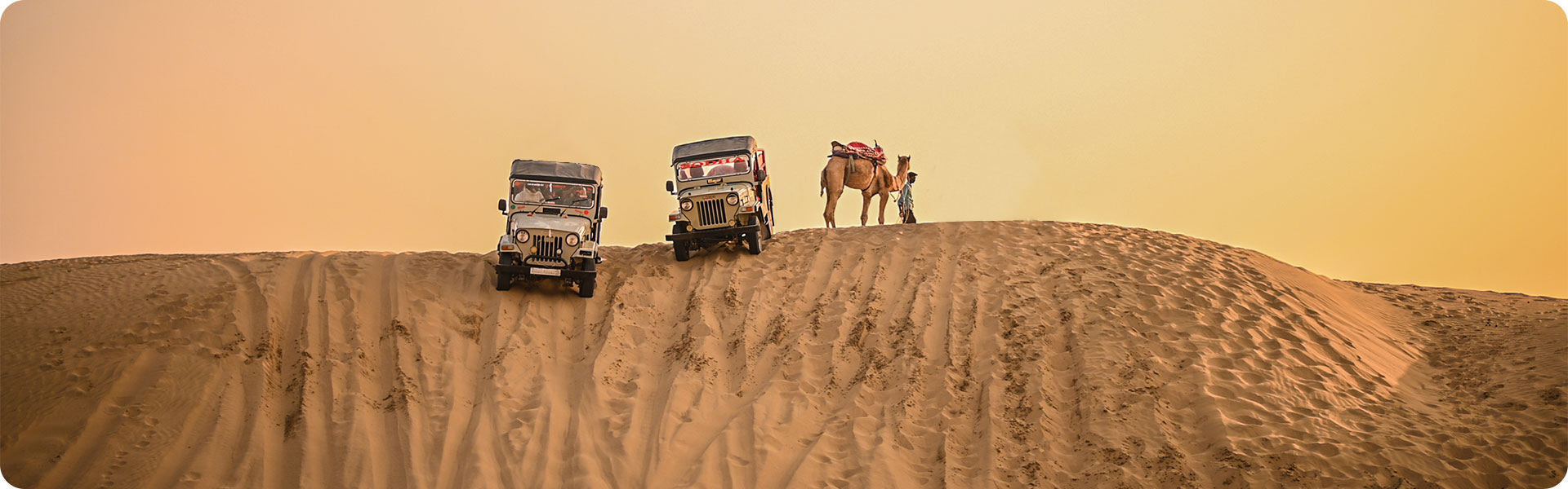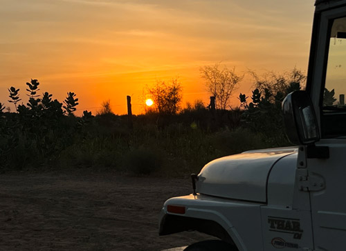 Jeep safaris are the fast and comfortable way to explore the beauty of the Thar Desert of Jaisalmer. Embark on a journey where a trained jeep driver will lead you to the thrilling trip into the Thar desert. A bumpy jeep ride with ups & downs on the dunes is very adventurous and fun filled. It is possible to enjoy a more comprehensive tour on the jeep. It is more adventurous and it is one of the many reasons why tourists love to go to Jaisalmer. The Jeep enables tourists to go around the area and see the beautiful surroundings more clearly. The Jeeps used for the safari are generally 4 x 4 keeping the top open to enjoy every bit of the tour. This adventure will gift you the memories to last a lifetime. Jeep Safari is optional and is not included with your stay. 05 to 06 Persons share 1 Jeep, however if you wish you can have exclusive Jeep Safari just for you and your family. You can enjoy Jeep Safari either in the evening at sunset or early morning at sunrise.